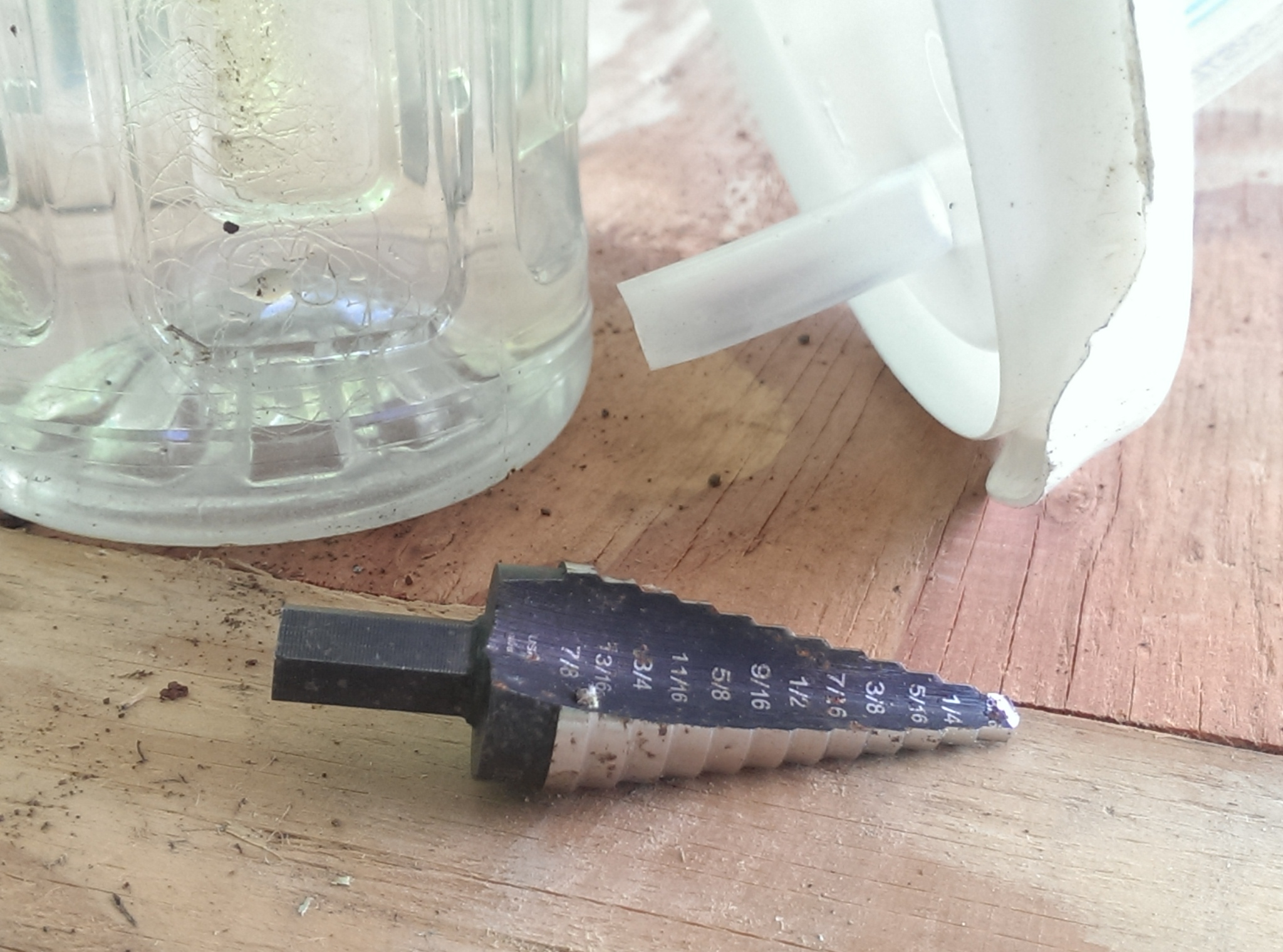 -Drill one hole in your bucket lid and one hole on the top of your beverage container.  The hole should be a very tight fit for the plastic tubing to fit through.