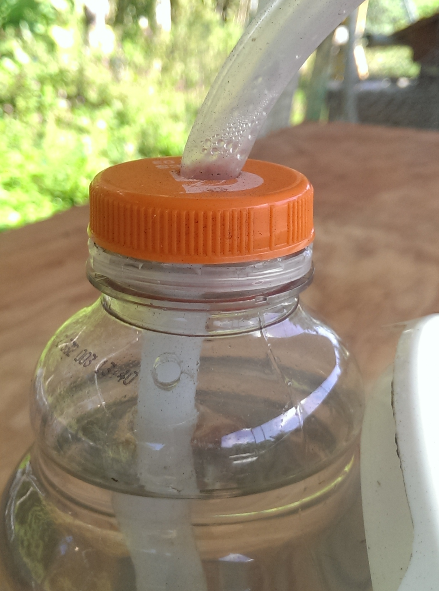 -Fill beverage bottle with water to just under the punctured hole level.  Make sure the tubing goes into the water.  The tubing coming through the  bucket lid into the bucket however should not be immersed in any liquid.