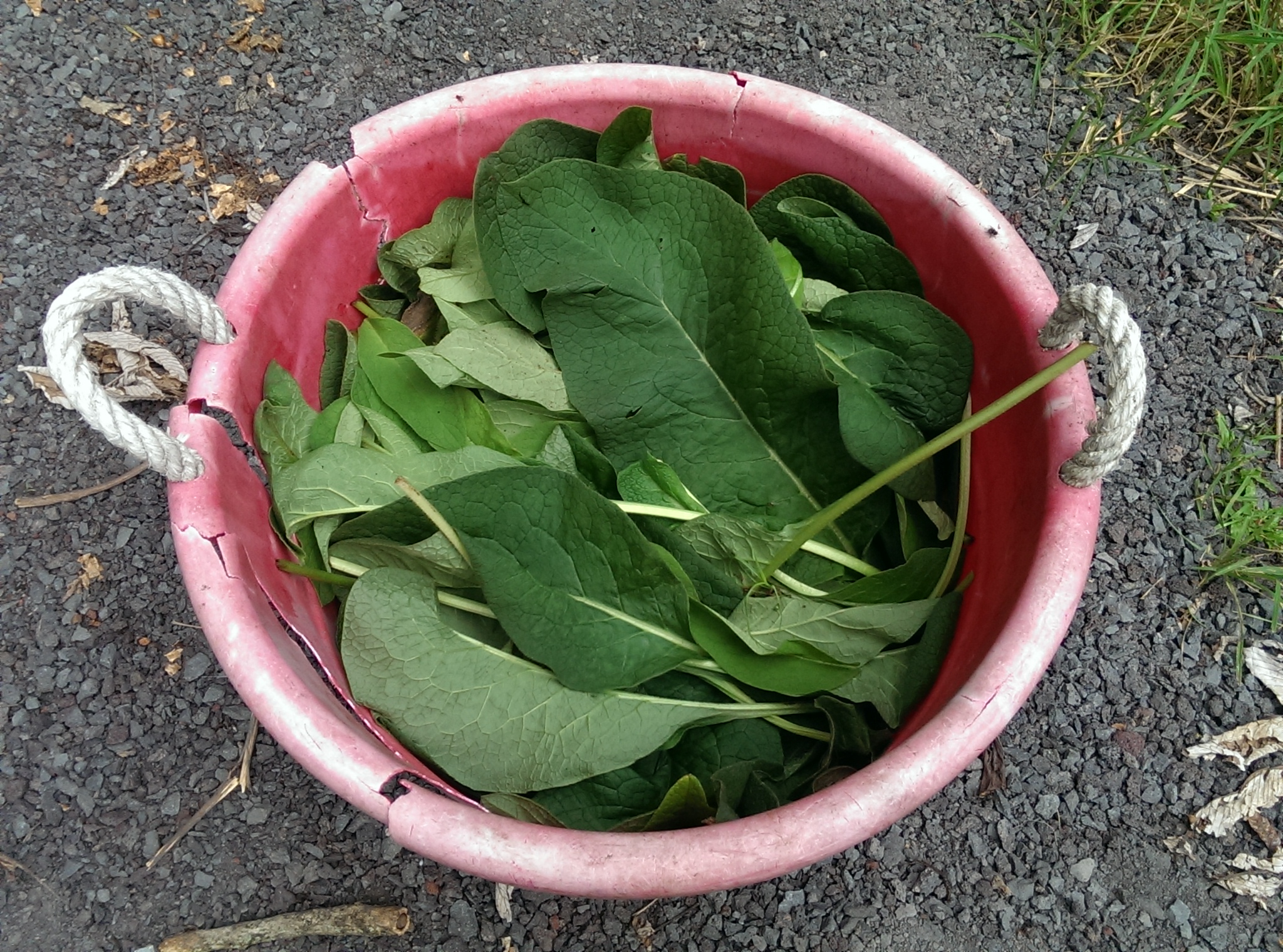Plants selected for the FPJ should be rapid, hardy growers. Best to avoid woody plants as they do not contain the nutrients to extract. Think leafy green. Before sunrise the plant is in respiration mode. After sunrise it is in photosynthetic mode therefor it is required that the harvesting of your plant should be done before sunrise to capture the desired nutrients. Also do not rinse the plants once collected. This will keep all healthy microbe activity to pass on to your fermentation process and increase the FPJ’s value. Select vibrant, healthy plants when harvesting. The plant we are using for FPJ is Comfrey. Comfrey is a fast growing plant producing huge amounts of leaves.