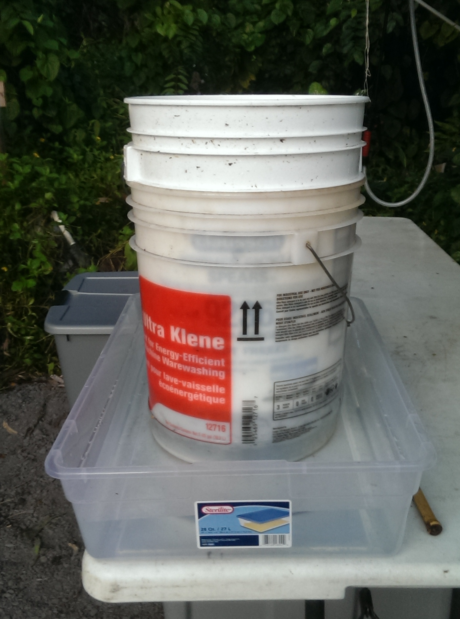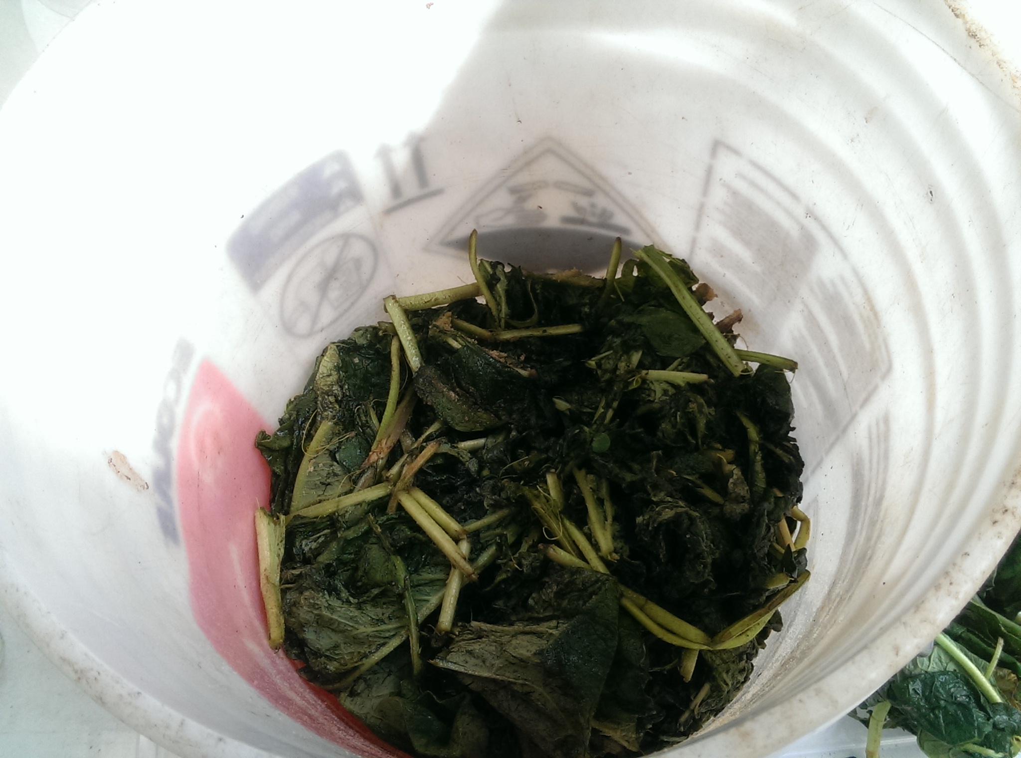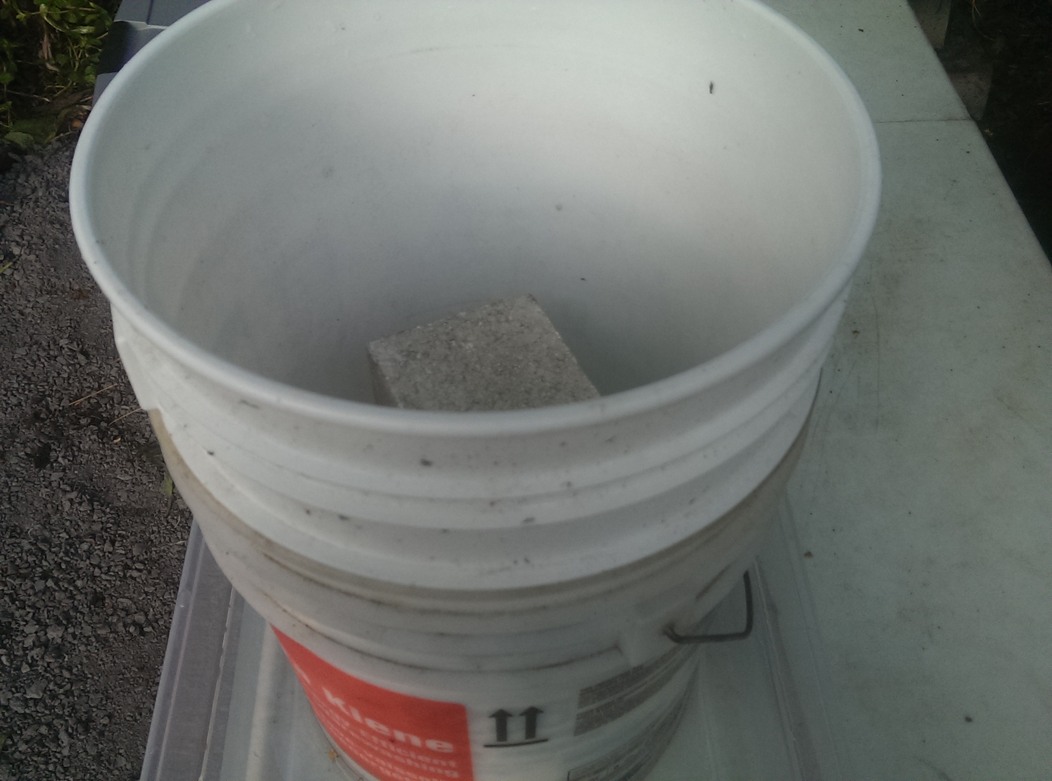 -Place second bucket on top of comfrey and place brick or large stone inside bucket to serve as a weight for 24 hours. Second bucket compresses the comfrey down to create a compact environment for the brown sugar to extract the moisture from the comfrey leaves. In addition the buckets should be placed in the middle of a shallow container of water to keep fire ants (if you live in the jungle) from infesting the brown sugar mixture.
