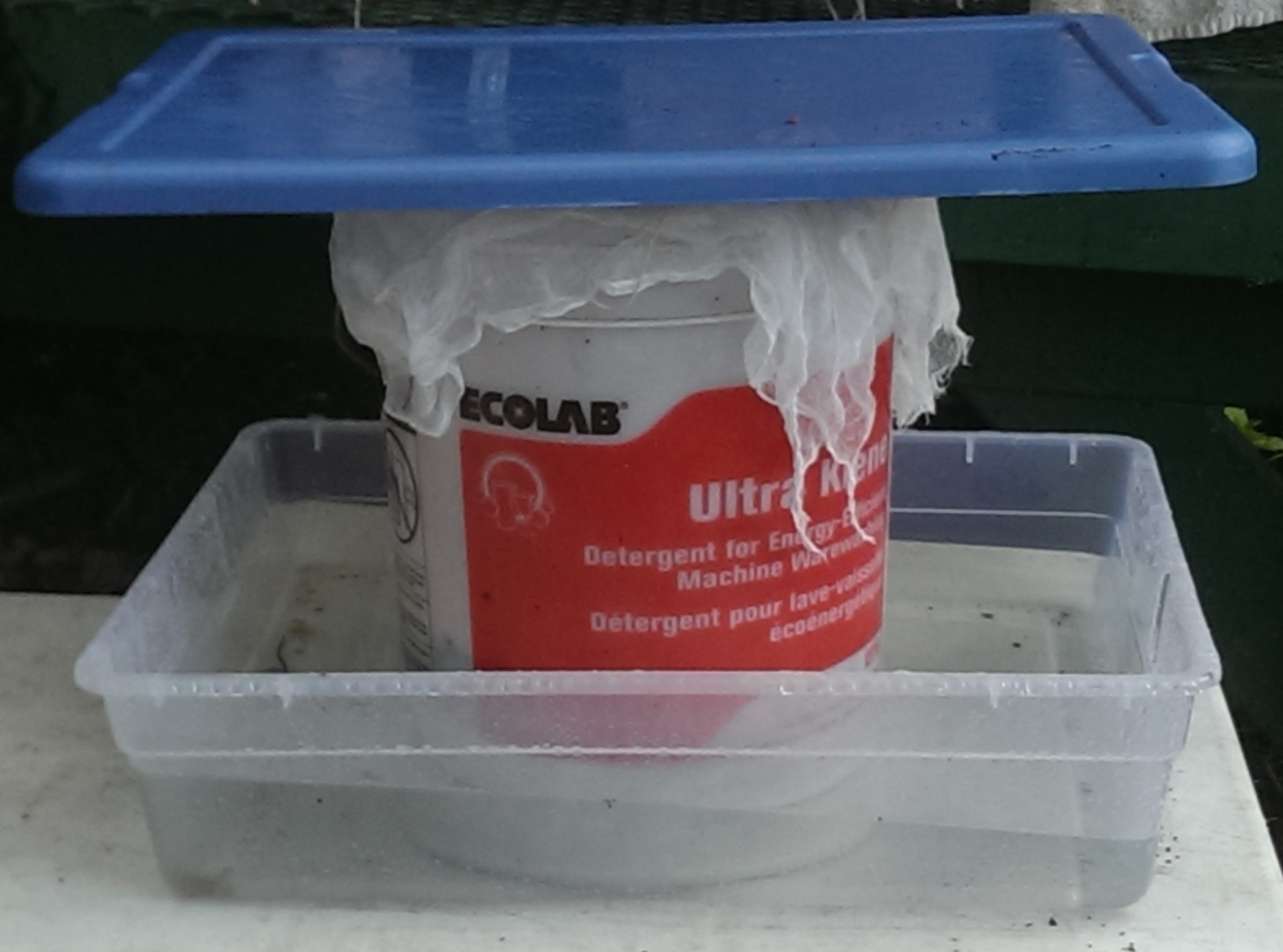 -After 24 hours of the compression, removed weighted bucket and put cheese cloth with string over fermenting comfrey. Placed a container lid lightly on top to keep rain out or keep in a very dry, shaded area. Also keep fermenting bucket in shallow container of water to keep the fire ants out.