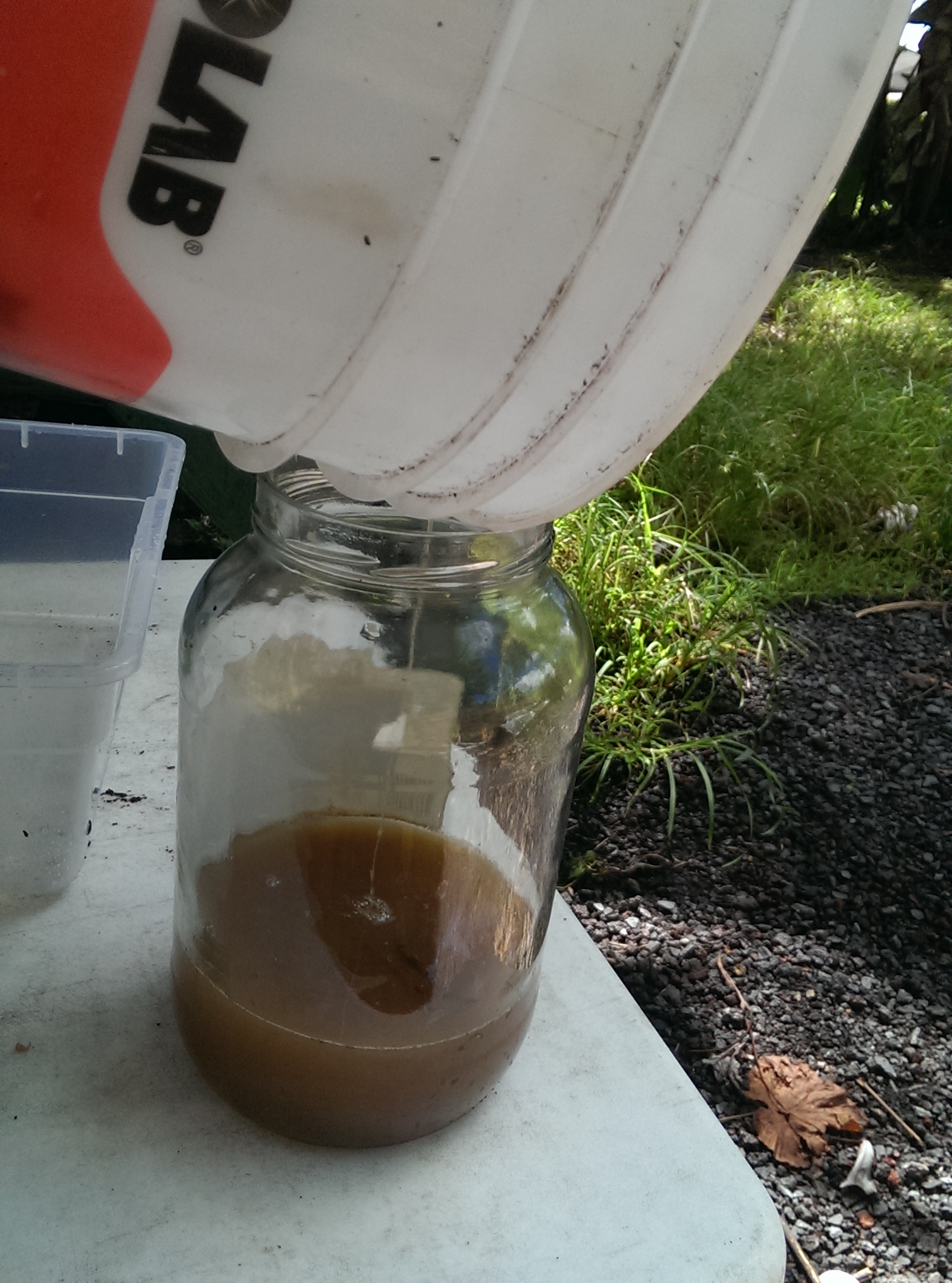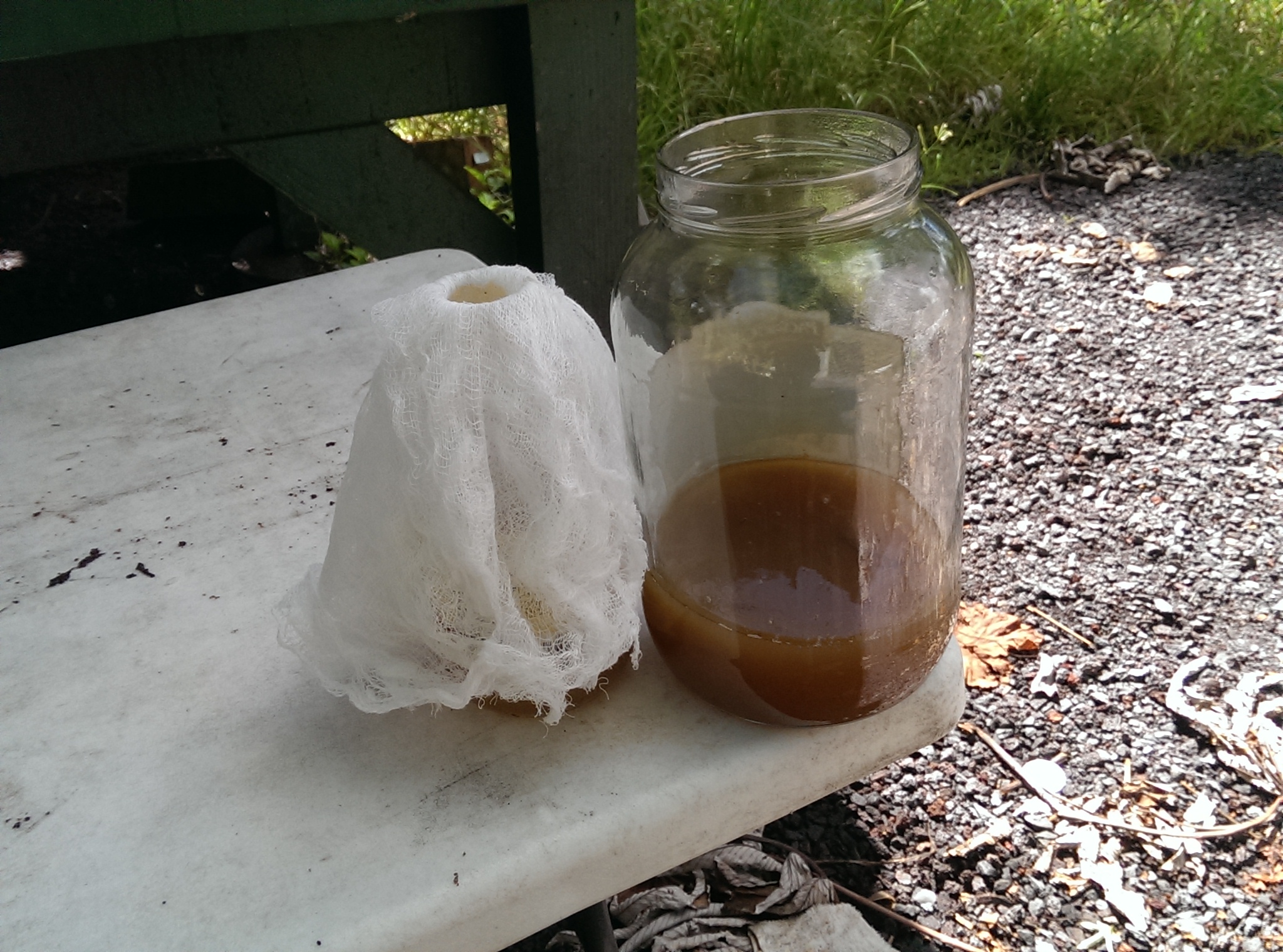 -After fermentation process is complete, gently pour the fermented plant juice out of bucket into new jar. (comfrey matter should be composted)