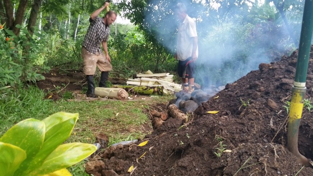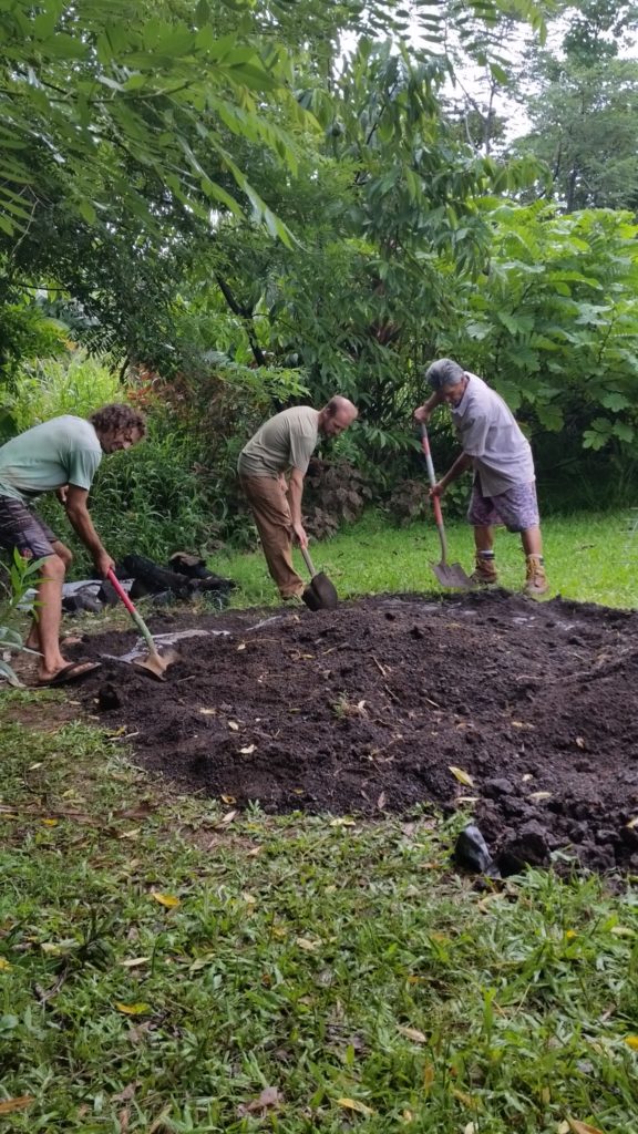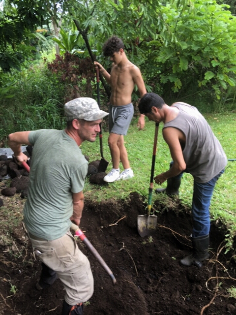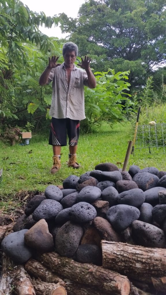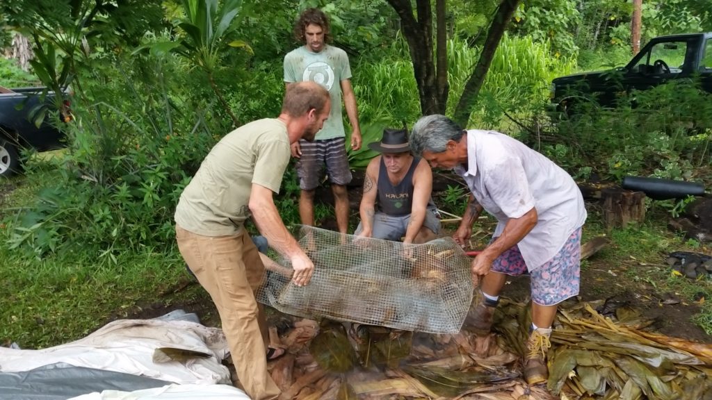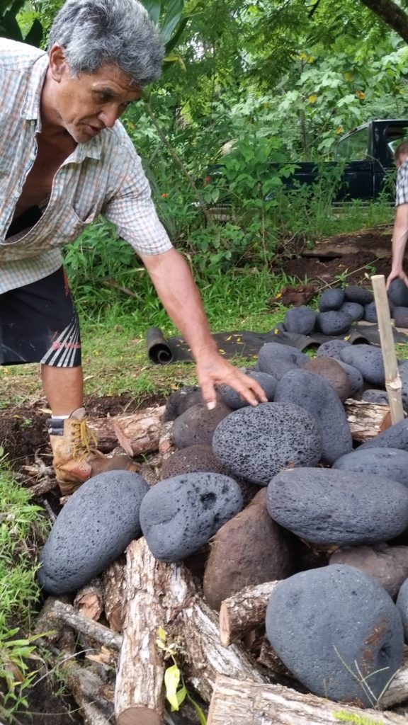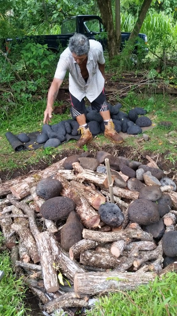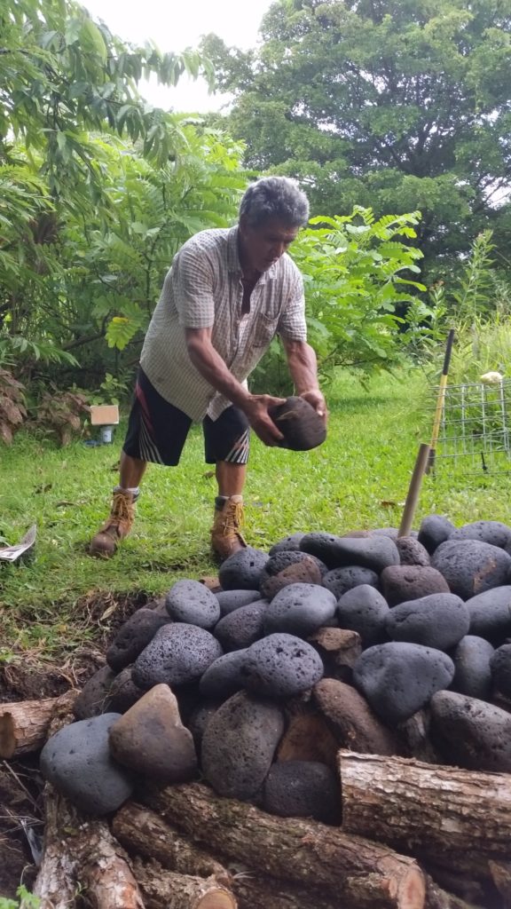 Kālua is a traditional Hawaiian cooking method. The Imu is the oven that is built underground. The large underground pit can bake, smoke, and steam large amounts of food at one time, including the 150 lb boar caught on the land. We called Laulima to create the imu with Uncle Crandall. Building and cooking the food in the imu will take two days.