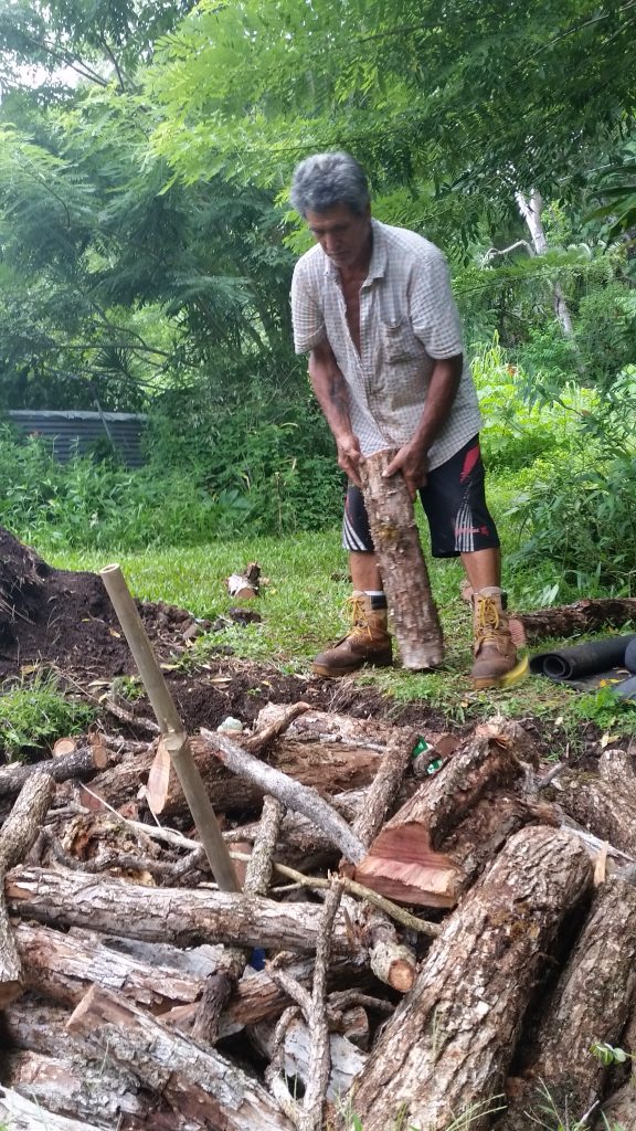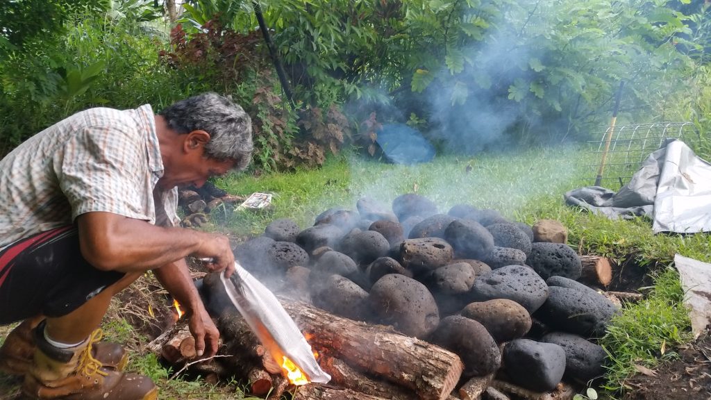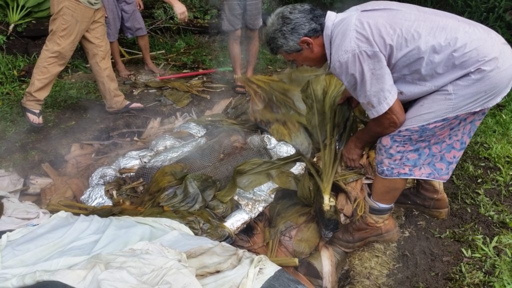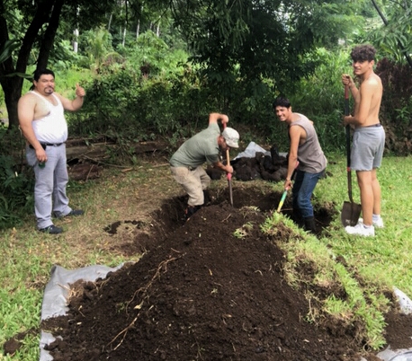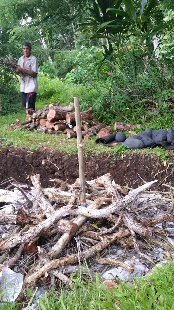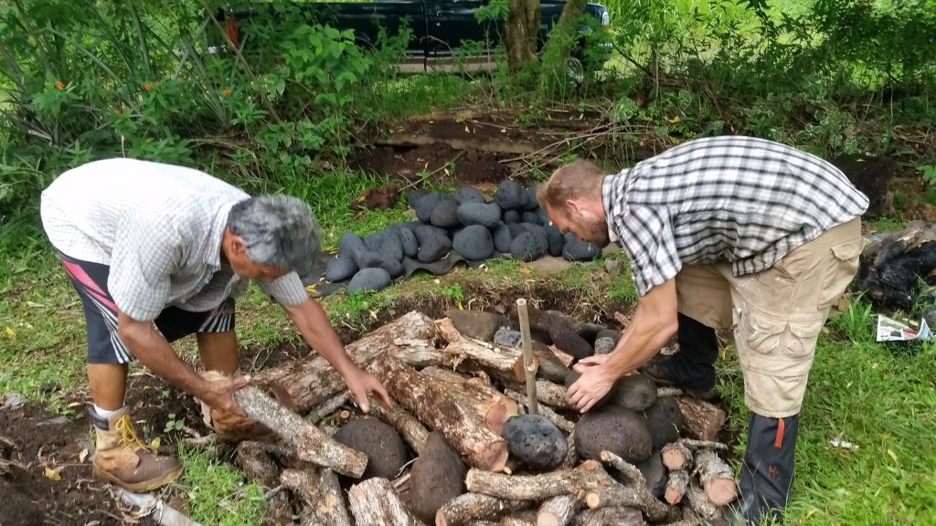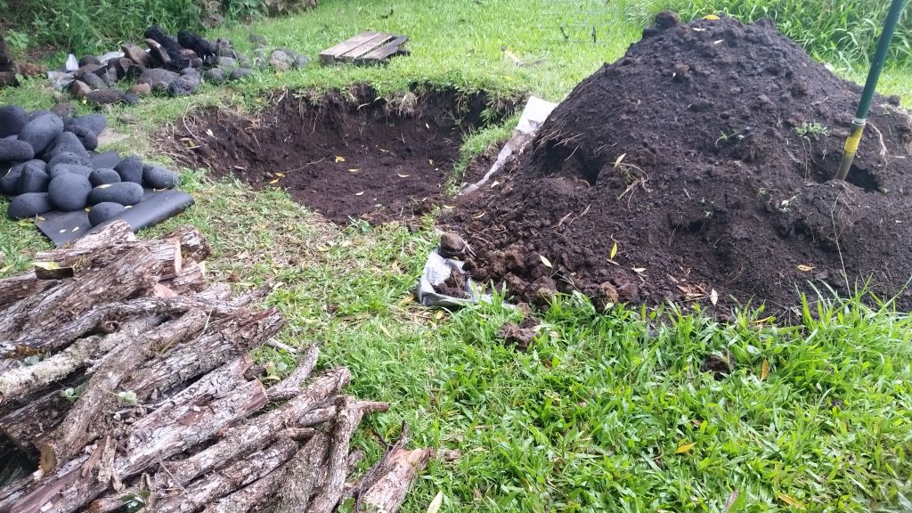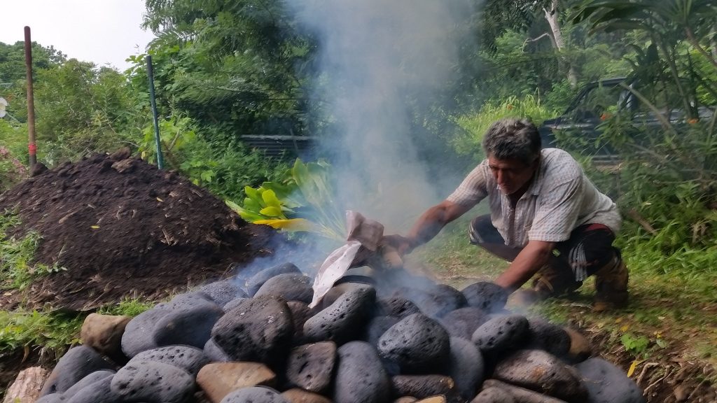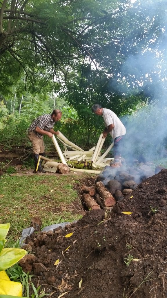 Kālua is a traditional Hawaiian cooking method. The Imu is the oven that is built underground. The large underground pit can bake, smoke, and steam large amounts of food at one time, including the 150 lb boar caught on the land. We called Laulima to create the imu with Uncle Crandall. Building and cooking the food in the imu will take two days.