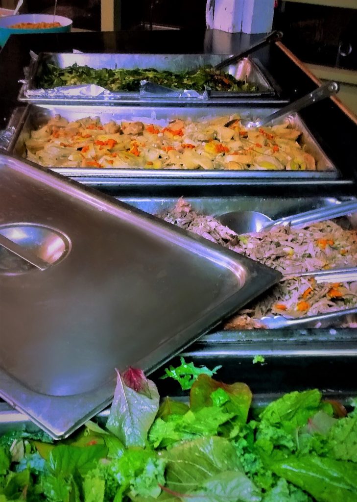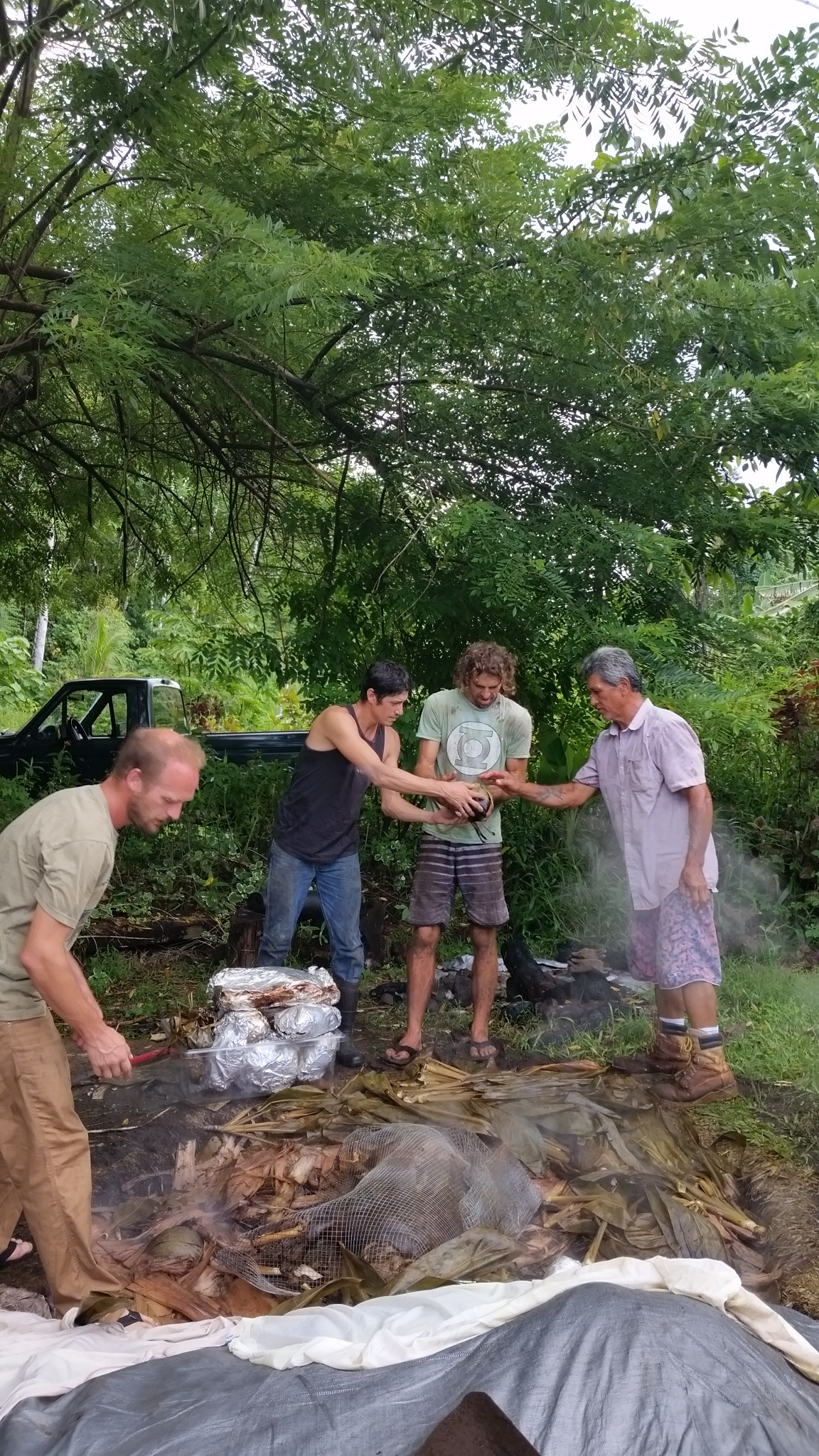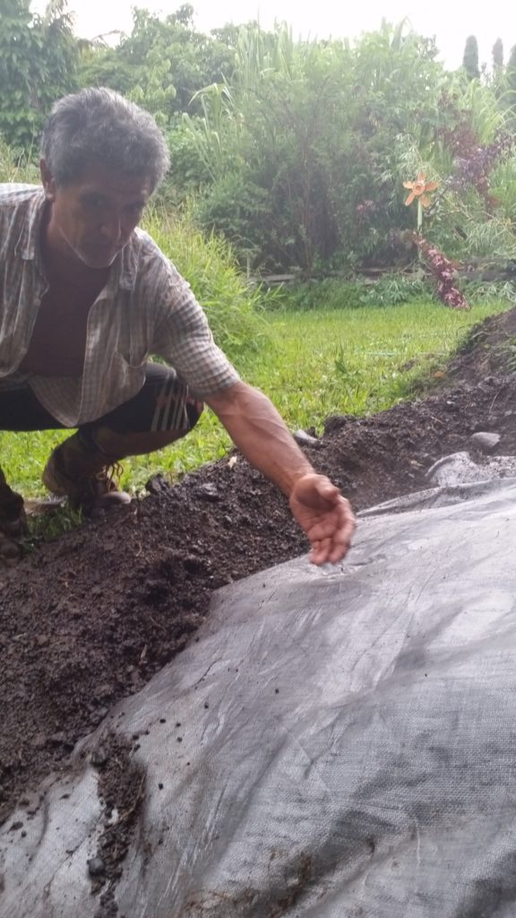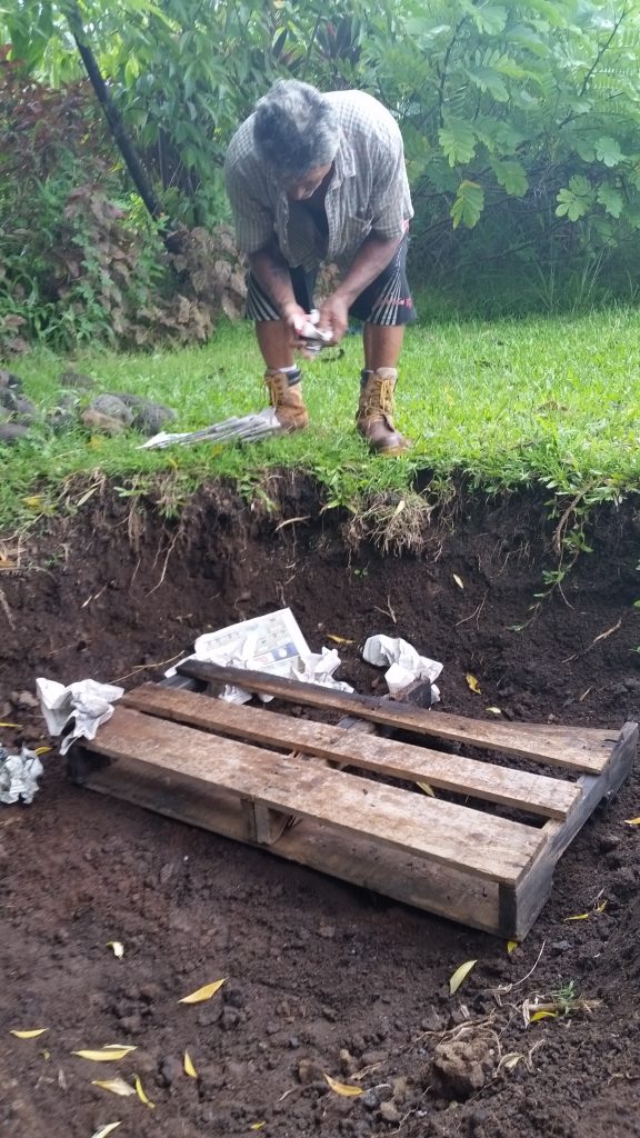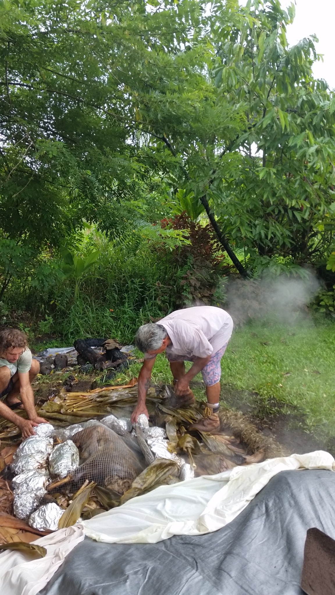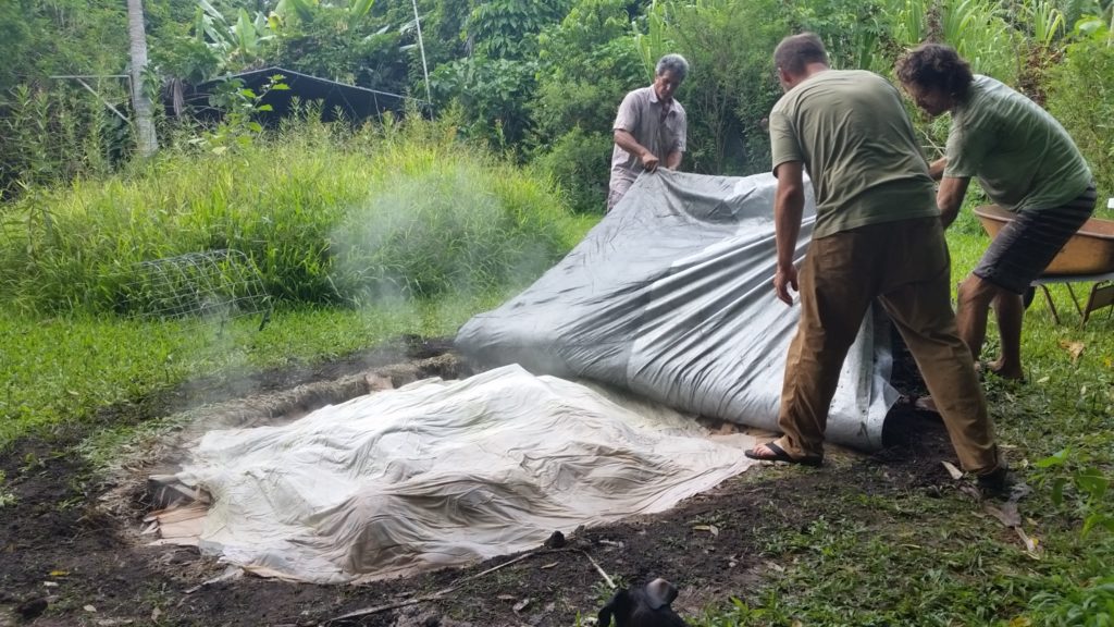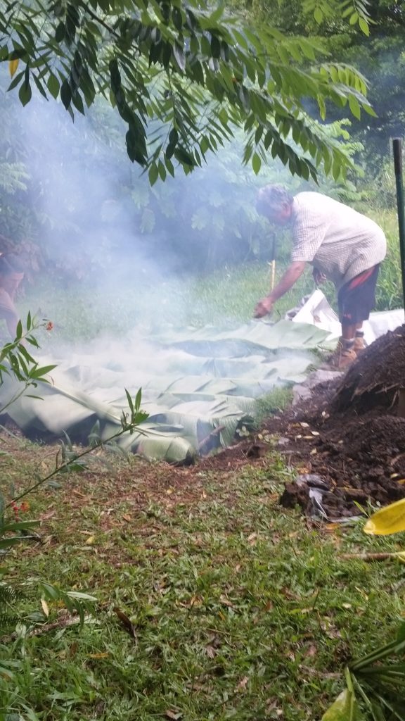 Another covering of Ti leaves are places over all the food. Crandall explains that the next layer is preferably burlap that has been soaked in water overnight. Not having any on property, we were able to obtain old towels and sheets that we soaked in water. This creates another layer of moisture for the imu. On top of the towles, a large tarp covers everything. The edges of the tarp are carefully covered with soil to seal in the steam and heat.