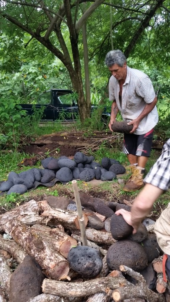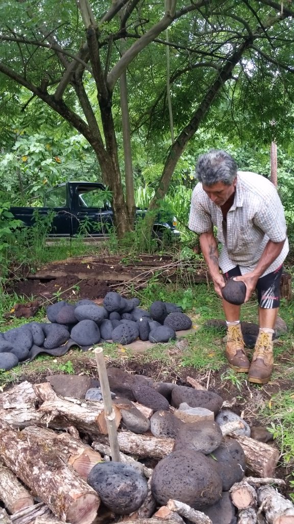 Uncle Crandall explained that rocks from the river is the best, however he retrieved these stones close by at a bay. “If selected from the ocean,” he instructed, “make sure you get the ones with the holes in them.” The porous stones are able to shatter less while holding the high heat with moisture.