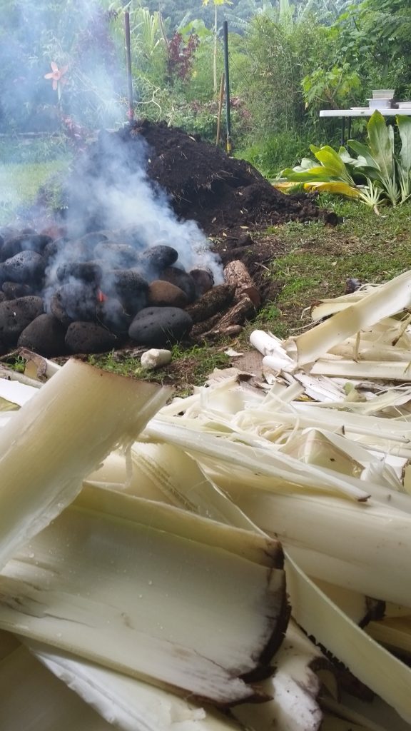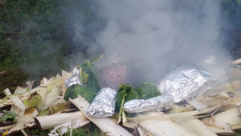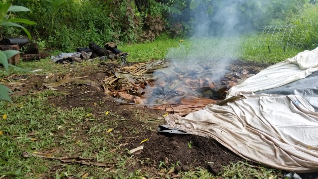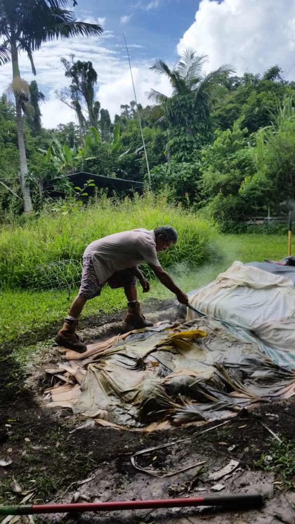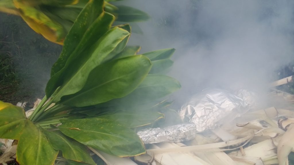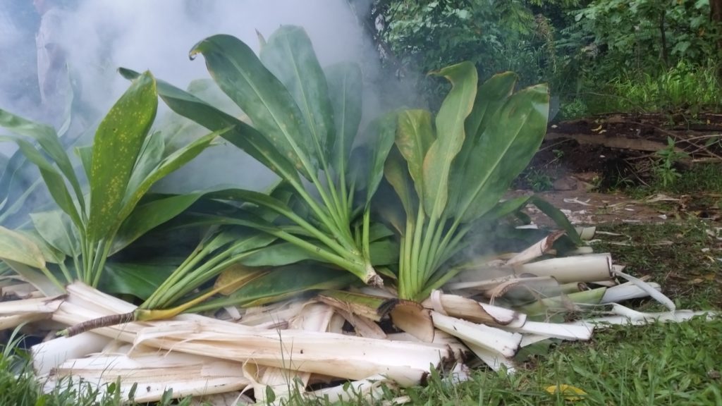 Once the imu heat is turned on high, the moisture needs to be added to create the steam. Banana stumps and leaves were freshly cut to create the next layer that will steam things up.