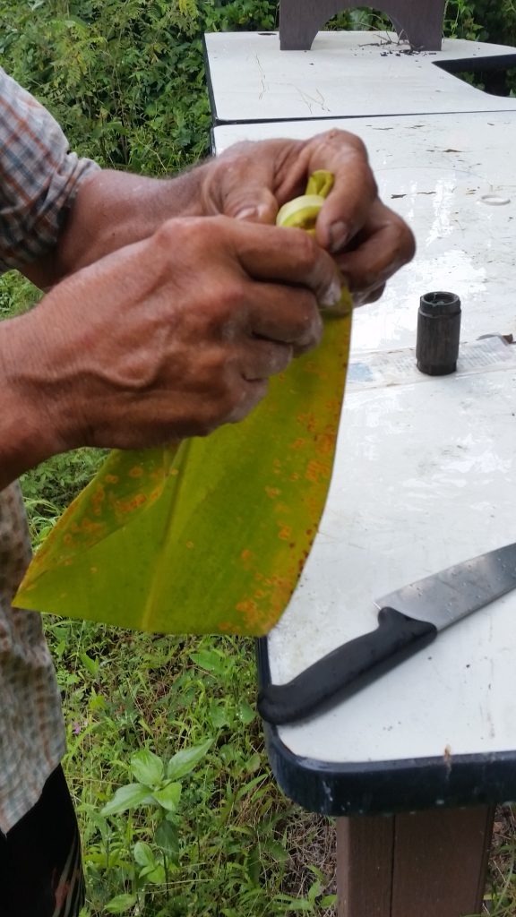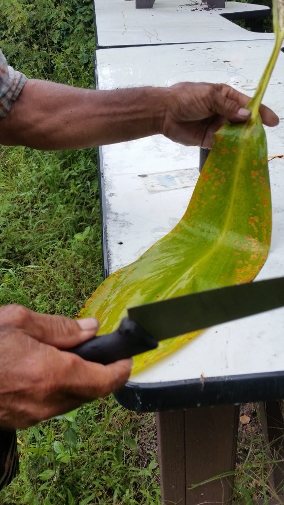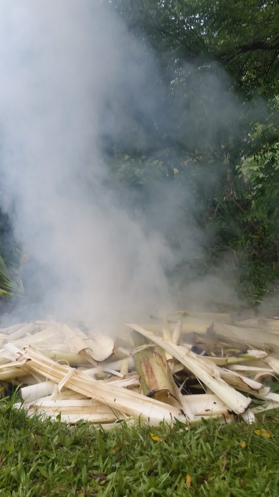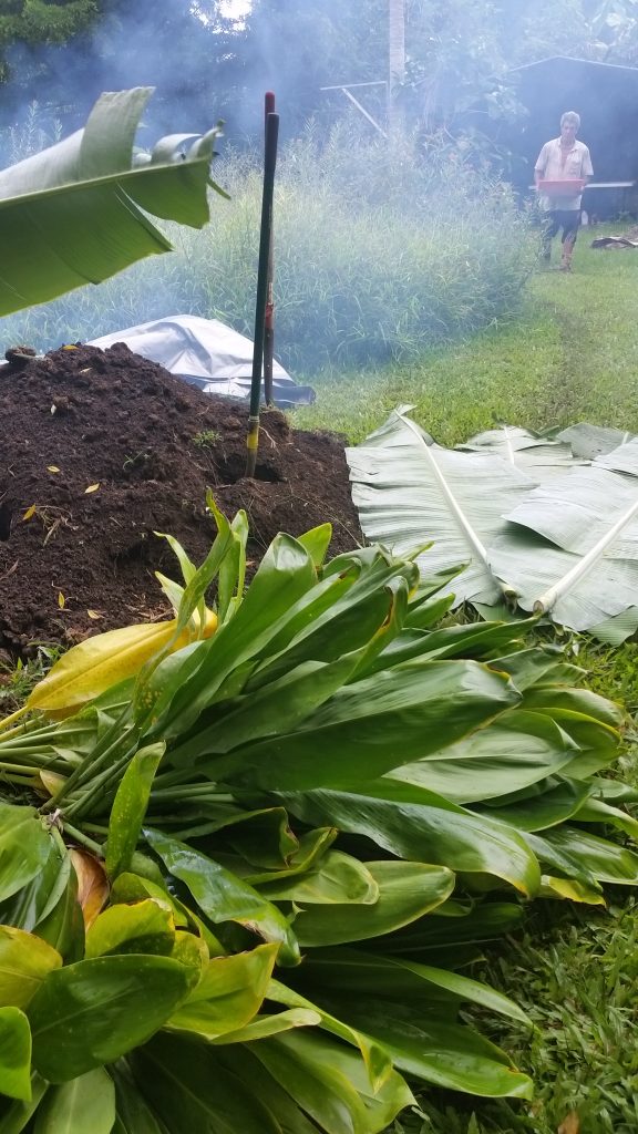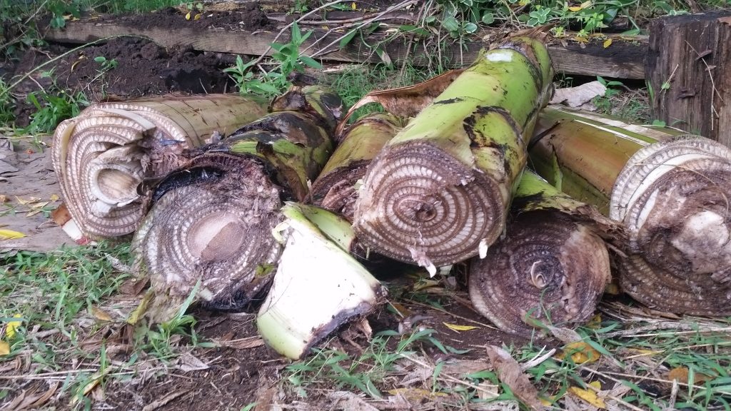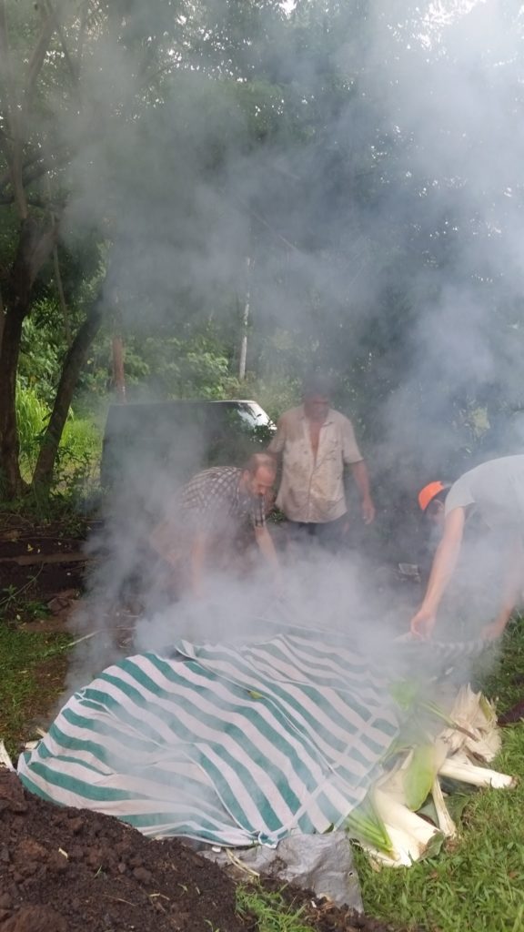 Once the imu heat is turned on high, the moisture needs to be added to create the steam. Banana stumps and leaves were freshly cut to create the next layer that will steam things up.