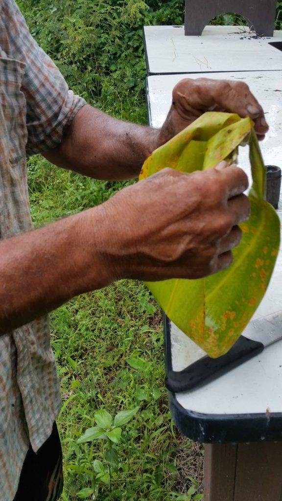 Crandall also instructed us how to prepare the Hawaiian Ti Plant leaf to wrap the vegetables in for the imu. We removed the spine stem from the middle and then could tie the Ti leaves together.