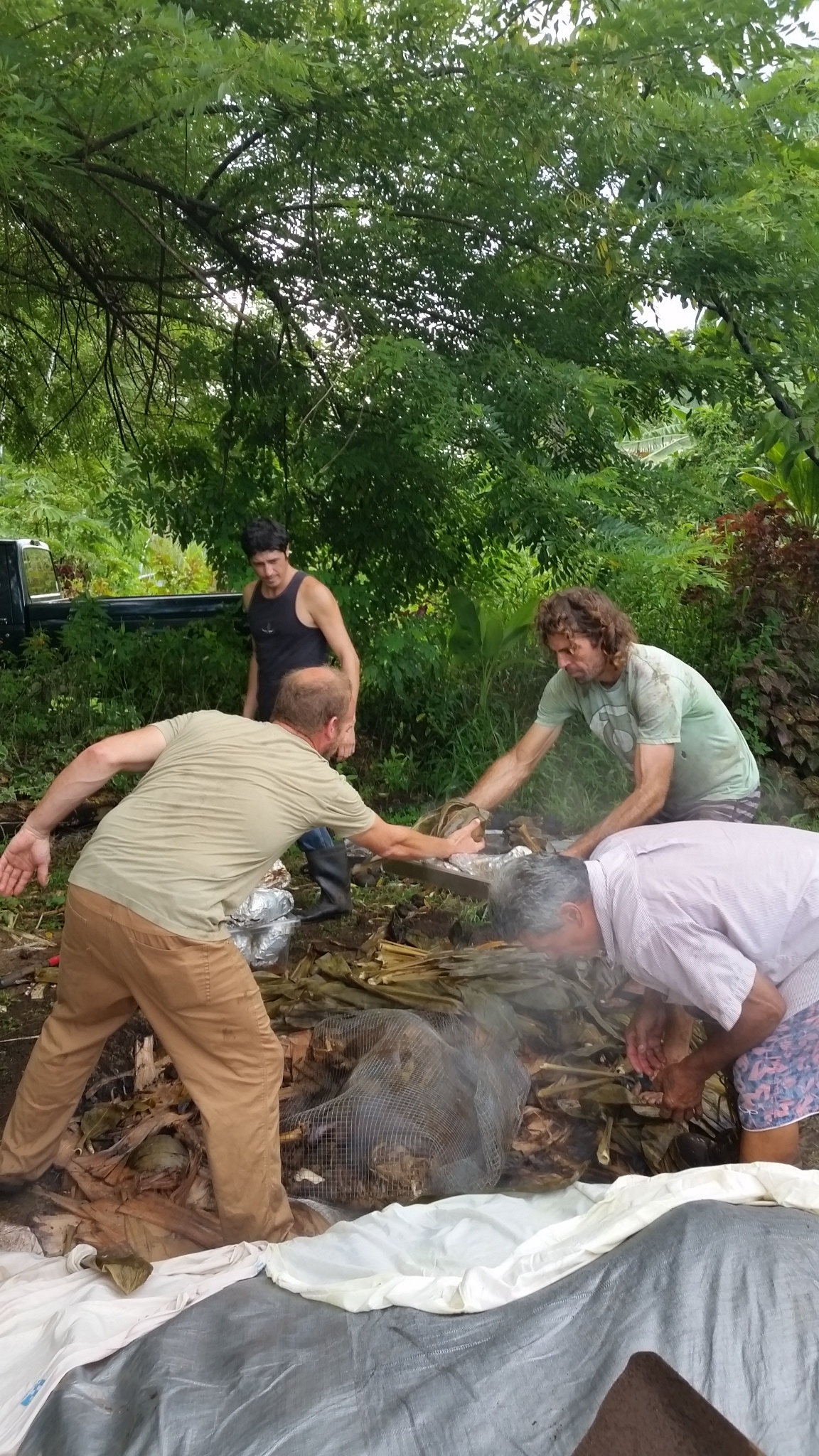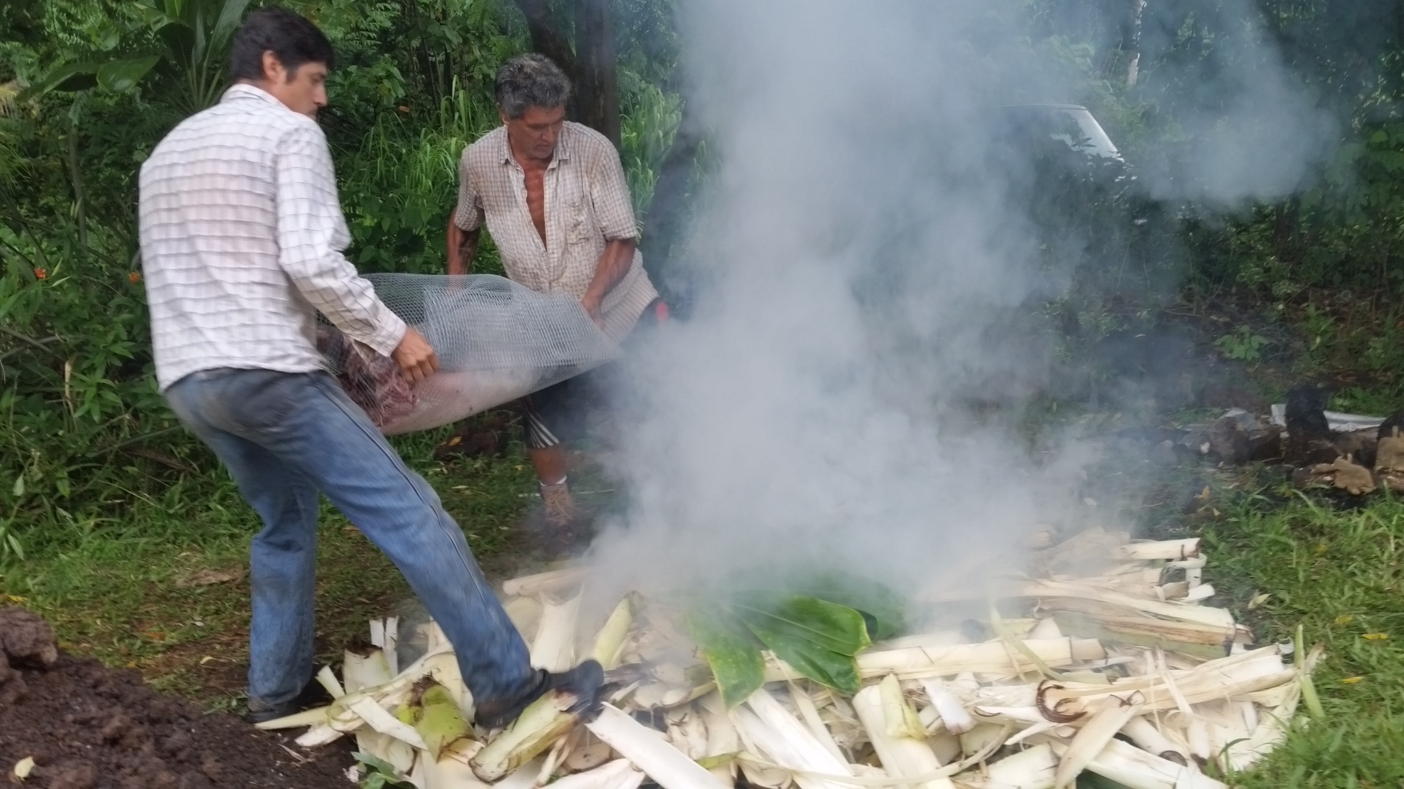 Steam ready, the Puaʻa was carried over and placed on top, wrapped in chicken wire to help with the handling in and out of the imu.