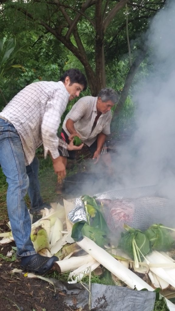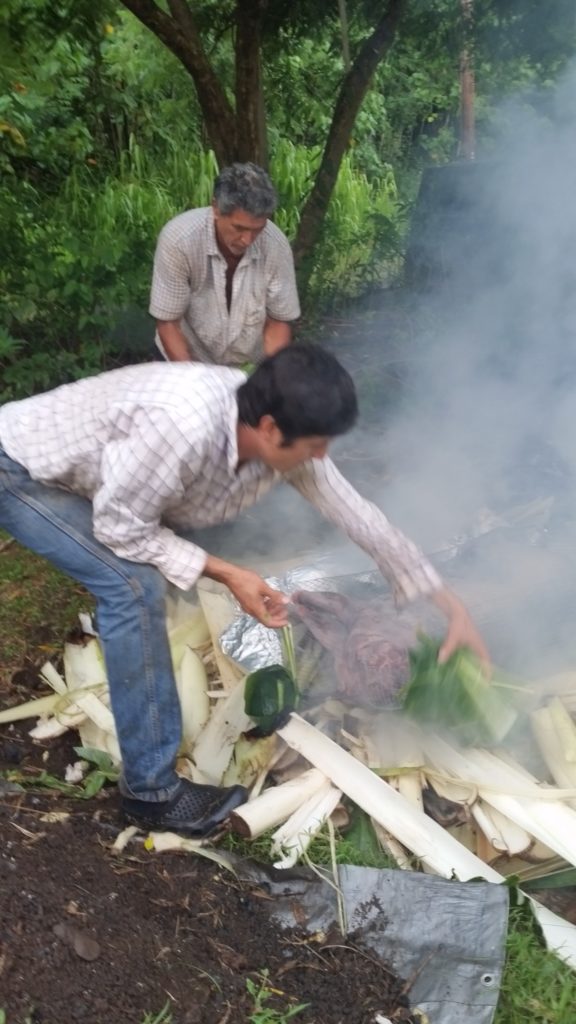 Pounding the fresh Banana stumps, we created a damp bedding that will be layered over the heated stones.