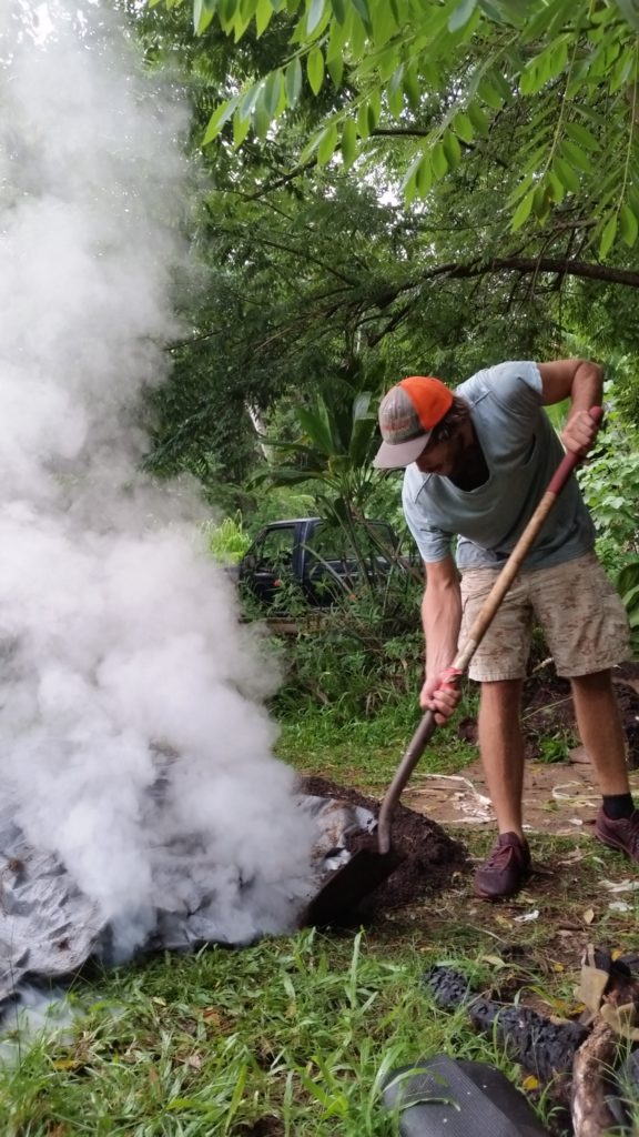 The imu is now cooling. Once cooled we will retrieve the ashes and biochar. The stones and soil will be replaced inside, and the ʻāina jungle will grow again on top in rapid speed. The imu pit now resting, until the next unearthing.